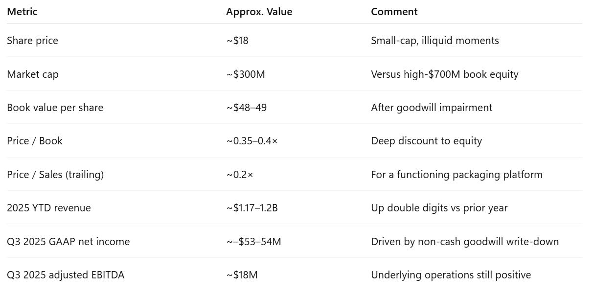 On paper, 2025 looks ugly. Q3 delivered a GAAP net loss of ~$53–54M on about $399M of sales, driven largely by a non-cash goodwill impairment of roughly $45–48M after the share price fell and long-lived asset values were reassessed. Underneath that accounting hit, volumes are higher, revenue is up double digits year-to-date, and adjusted profitability is improving versus 2024.