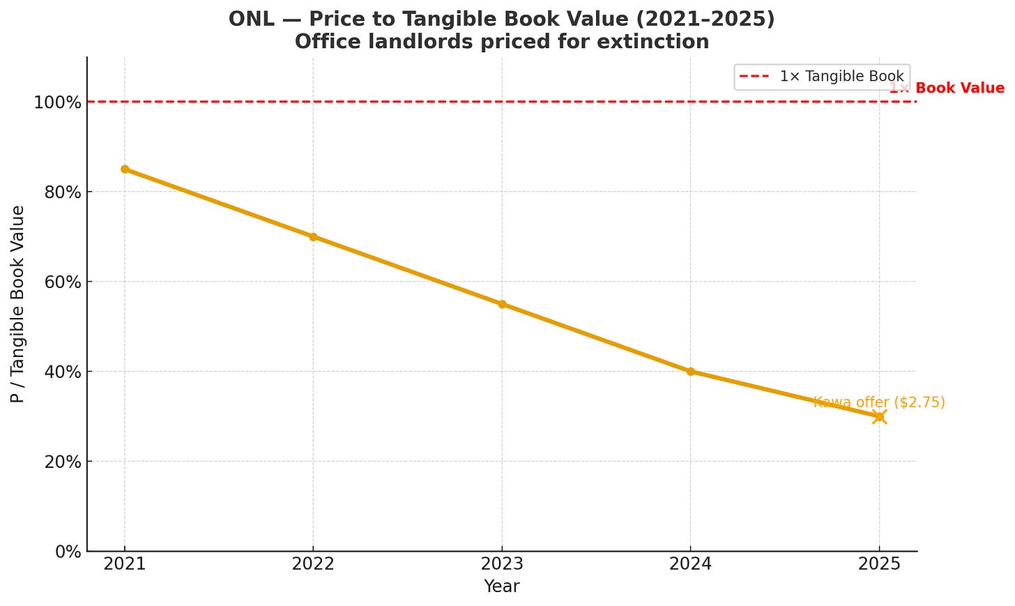 📊 Office landlords are priced for extinction — ONL trades far below tangible book, as if every lease disappears tomorrow.