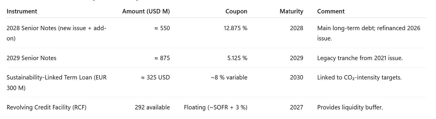 In early 2025, Mercer complemented this with a new €300 million sustainability-linked term loan, designed to finance decarbonization projects and partially hedge currency risk between its European mills and Canadian operations. The facility carries a step-down coupon if ESG intensity targets are met, making it cheaper than unsecured notes.