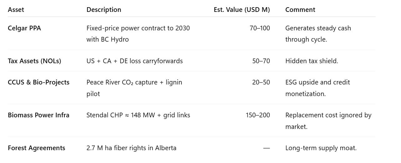 Where others see leverage and cyclicality, Fragments sees hard assets with optionality. Mercer’s infrastructure is expensive to replicate, anchored by decades of fiber rights, power contracts, and industrial land. The current share price near 3 USD values the firm like a liquidation — yet replacement cost easily exceeds 20 USD per share.